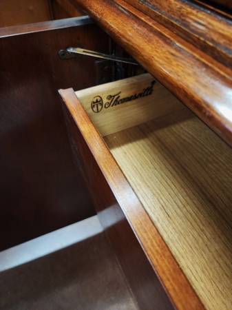 This is beautiful Thomasville Collection mahogany breakfront China cabinet with a pierced wood pediment on top. It is in excellent condition. It is a 2 piece. There is one drawer in the center bottom cabinet. The 2 side bottom cabinets have one shelf. Top is lighted with 3 glass shelves.