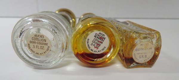 and three glass collectible Cotillion bottles,