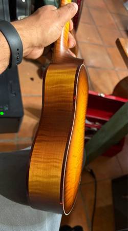 This uke has been played a bit, some bumps and bruises (as the photos show) but overall nothing noticable to your audience. An all-maple construction, apart for the rosewood fretboard. The flame on the body and neck is truly stunning and the ornate National headstock with tortoise shell faceplate is a conversation starter al by itself. No one does it better. Currently strung with Guadalupe custom strings (hand made by a small shop in Los Angeles).